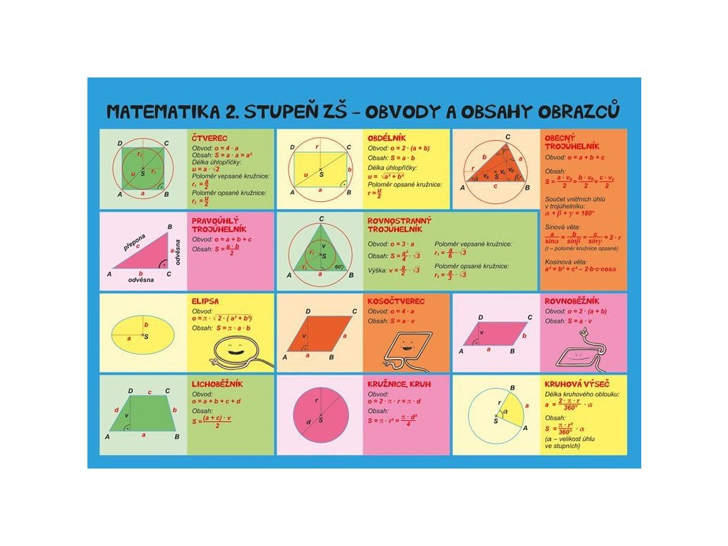 Laminátová kartička určená pro žáky druhého stupně základních škol a středních škol nabízí v graficky přehledné a stručné formě základní vzorce pro výpočet obvodů a obsahů obrazců a povrchů a objemů těles. Zároveň poskytuje dětem i mnemotechnické pomůcky, jak si vzorce zapamatovat.Doplňkové parametry