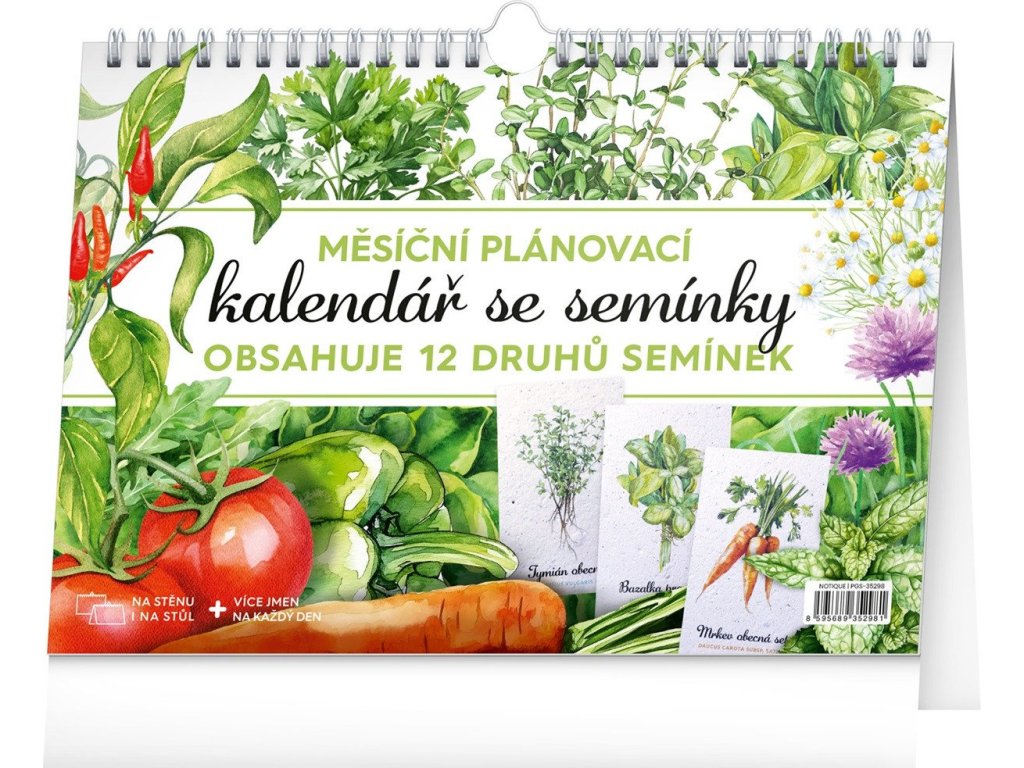 Měsíční kalendář obsahující dvanáct archů se semínky k zasazení, který můžete použít jako stolní nebo ho pomocí háčku zavěsit na zeď.Objevte jedinečný stolní kalendář, který vám každý měsíc nabídne nejen dostatek prostoru na poznámky, ale i semínka rostlin, jež si můžete snadno vypěstovat doma. Stačí zasadit speciální semínkový papír do hlíny, zalévat a sledovat, jak vám rostou rajčata, bazalka, meduňka a další bylinky či zelenina. Ideální pro všechny, kteří chtějí zažít radost z pěstování a mít kousek zahrádky přímo u sebe doma. Obahuje měsíční kalendárium s českými svátky a jmeninami a 12 archů speciálního papíru se semínky.