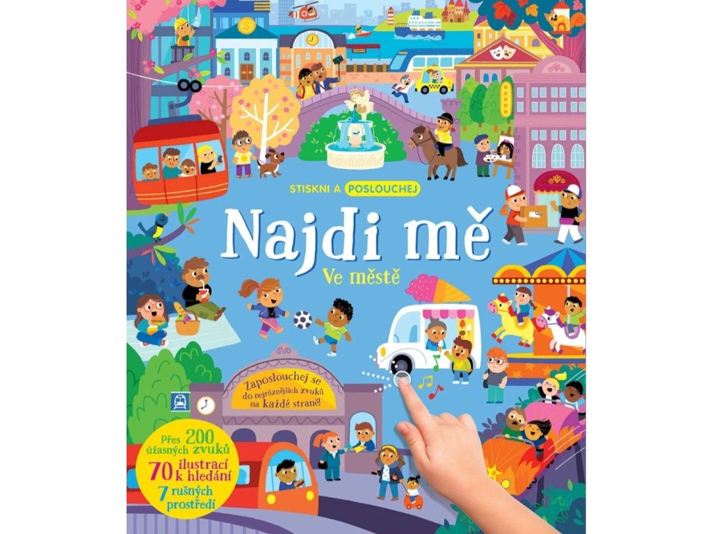 Objevujte na stránkách této úžasné zvukové knížky přes 200 zvuků z města! Celé město na stránkách doslova ožije, jakmile u ilustrací stisknete vyznačené místo. Tato kniha obsahuje jak skutečné zvukové prvky, tak i namluvené názvy míst, věcí, památek či budov. Kniha je tedy pro malé děti tak zajímává a interaktivní, že nepotřebují ani žádného dospěláka, který by jim názvy musel předčítat! V knize se dozvíte informace a zajímavosti o stavbách, vozidlech i lidech s různými zaměstnáními, a dokonce přes 70 obrázků můžete hledat v režimu "hry". Tak na nic nečekejte, pojďte se seznámit s městem a objevujte, jaké zvuky v něm najdete.Prodejní cena zvukové knihy již obsahuje recyklační poplatky.