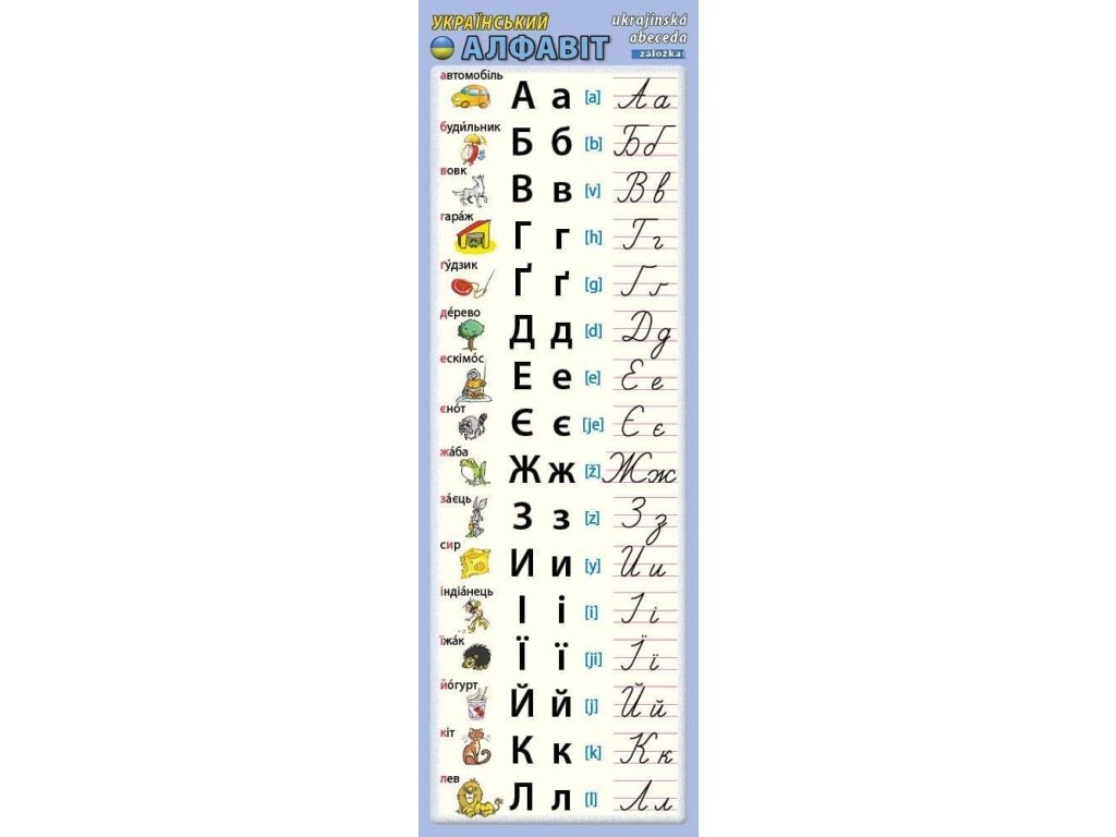 Záložka obsahuje přehledně zpracovanou ukrajinskou abecedu včetně výslovnosti a názorného obrázku.Doplňkové parametry